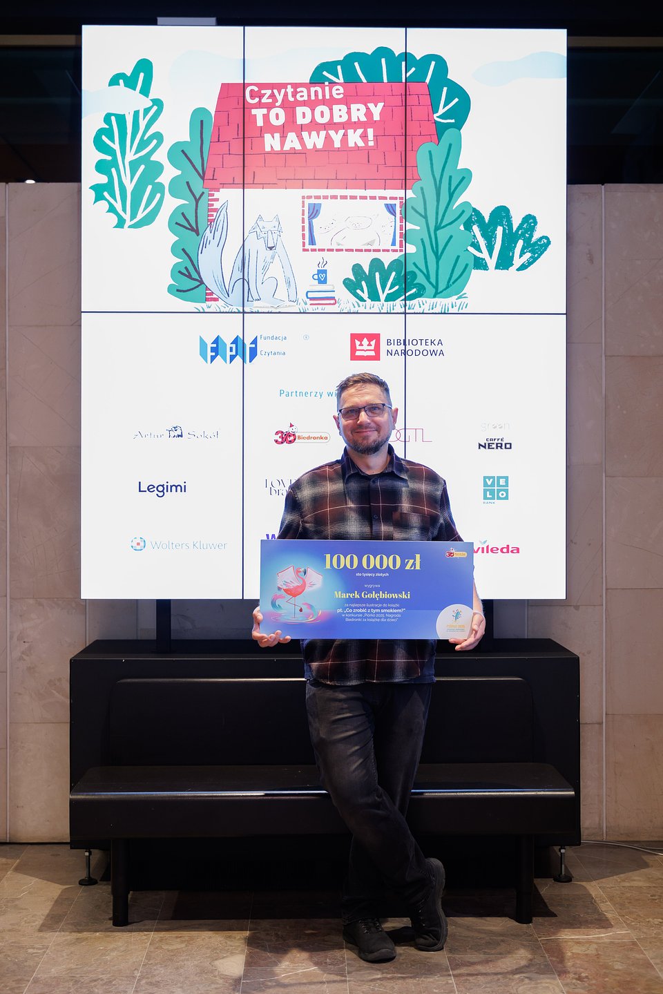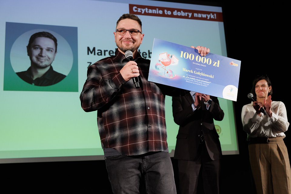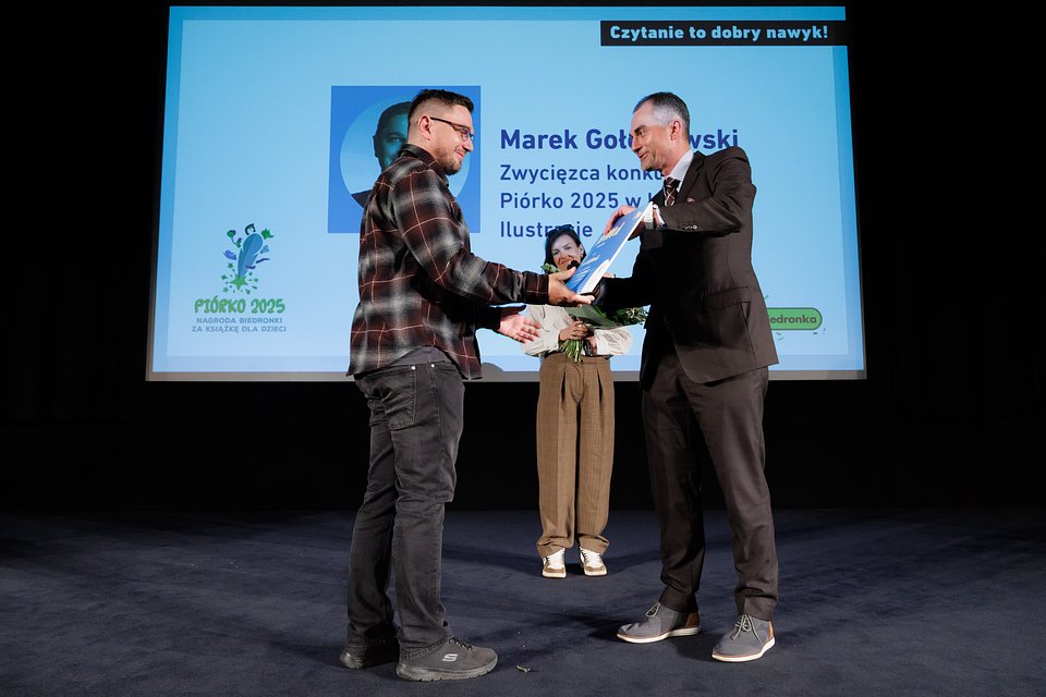 Podczas uroczystej gali, 9 września w Bibliotece Narodowej w Warszawie, w ramach Wieczoru Przyjaciół Fundacji Powszechnego Czytania, poznaliśmy nazwisko zwycięzcy konkursu „Piórko 2025. Nagroda Biedronki za książkę dla dzieci” w kategorii ilustracja. Chwilę później Marek Gołębiowski odebrał symboliczny czek na 100 000 zł – nagrodę, na którą pracował od lat. Za działania na rzecz promocji czytelnictwa sieć Biedronka została uhonorowana Kariatydą Czytelnictwa w kategorii Dobry Wzór Biznes.