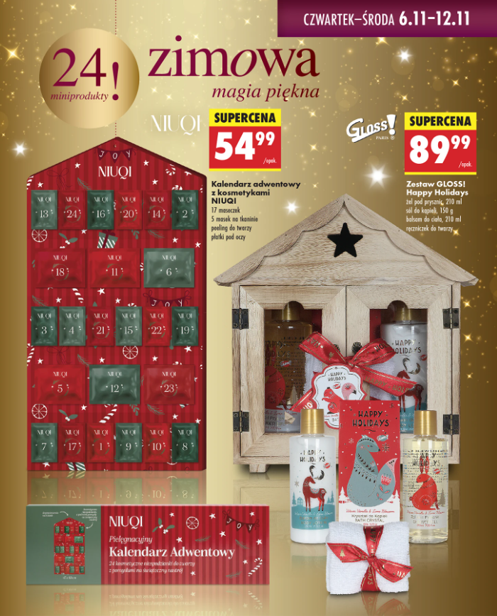 - kalendarz adwentowy NIUQI z 17 maseczkami, 5 maskami na tkaninie, peelingiem do twarzy i płatkami pod oczy – za 54,99 zł.