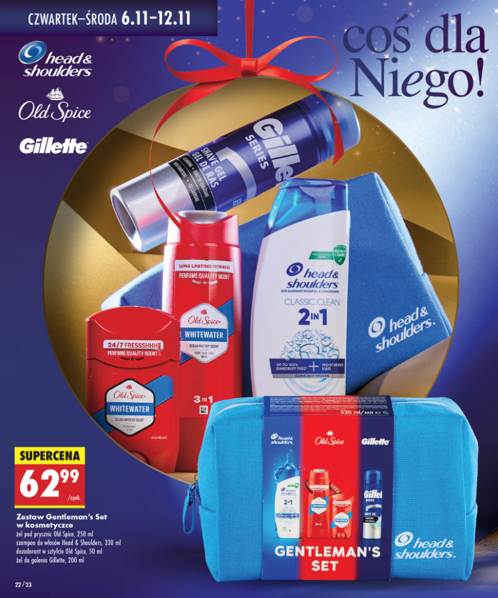 - Zestaw Gentleman's Set w kosmetyczce, który łączy w sobie produkty takie jak: żel pod prysznic Old Spice (250 ml), szampon Head & Shoulders (330 ml), dezodorant w sztyfcie Old Spice (50 ml) i żel do golenia Gillette (200 ml) – za 62,99 zł.