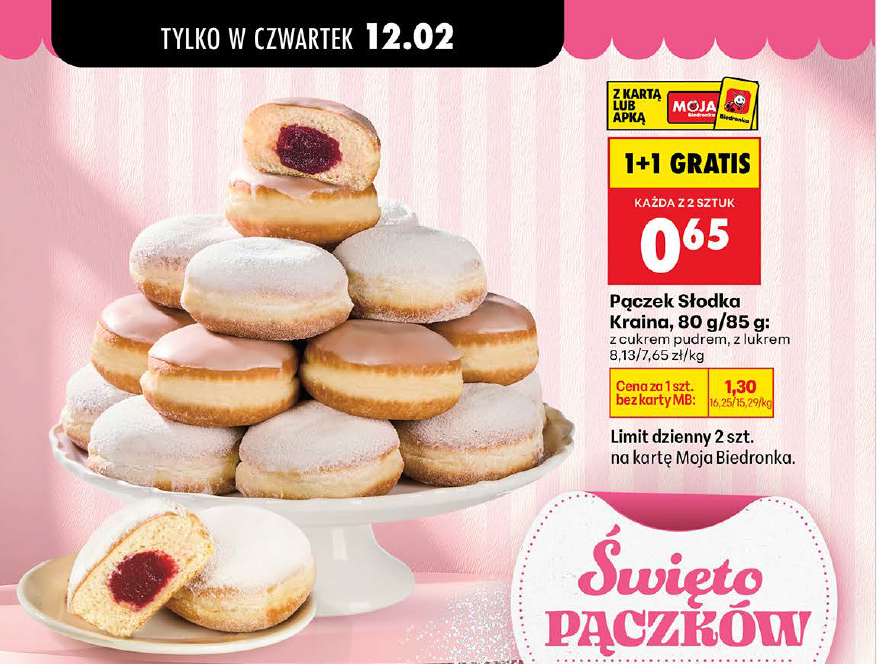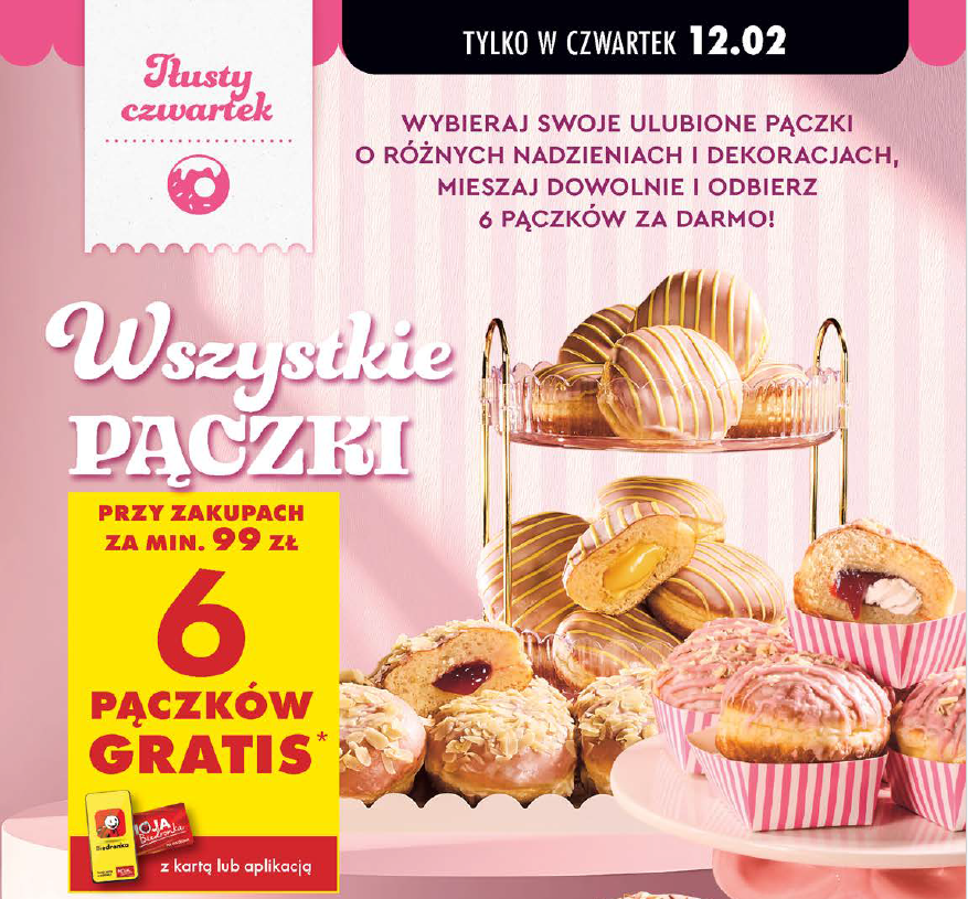 Biedronka przygotowała na tegoroczny Tłusty Czwartek (12 lutego) rekordową ofertę słodkości – klienci korzystając z promocji kupią pączki nawet za 5 gr/szt., a przy zakupach za 99 zł otrzymają je gratis. W sklepach dostępne są zarówno klasyczne pączki z nadzieniem różanym czy malinowym, jak i bardziej nowoczesne propozycje smakowe: tiramisu, mascarpone z truskawką, nadzieniem mleczno‑orzechowym, a nawet z kruszonką.
